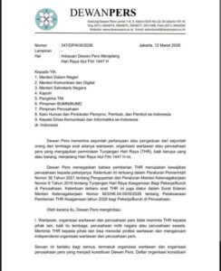 Jakarta — Dewan Pers mengeluarkan imbauan kepada wartawan, organisasi wartawan, serta perusahaan pers agar tidak meminta Tunjangan Hari Raya (THR) kepada lembaga pemerintah maupun pihak swasta menjelang Hari Raya Idul Fitri 1447 Hijriah.