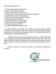 Dalam surat tersebut dijelaskan bahwa Dewan Pers menerima sejumlah pertanyaan dan pengaduan dari masyarakat terkait adanya wartawan, organisasi wartawan, maupun perusahaan pers yang meminta THR kepada instansi pemerintah, BUMN, BUMD, hingga perusahaan swasta.