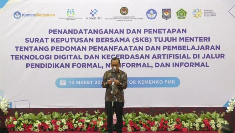 Jakarta — Pemerintah Indonesia menetapkan pembatasan penggunaan kecerdasan buatan (Artificial Intelligence/AI) instan bagi siswa pendidikan dasar hingga menengah melalui Surat Keputusan Bersama (SKB) tujuh kementerian. Kebijakan tersebut diumumkan di Kantor Kementerian Koordinator Bidang Pembangunan Manusia dan Kebudayaan yang disiarkan melalui kanal resmi YouTube Kemenko PMK, Jakarta Pusat, Kamis (12/3/2026).